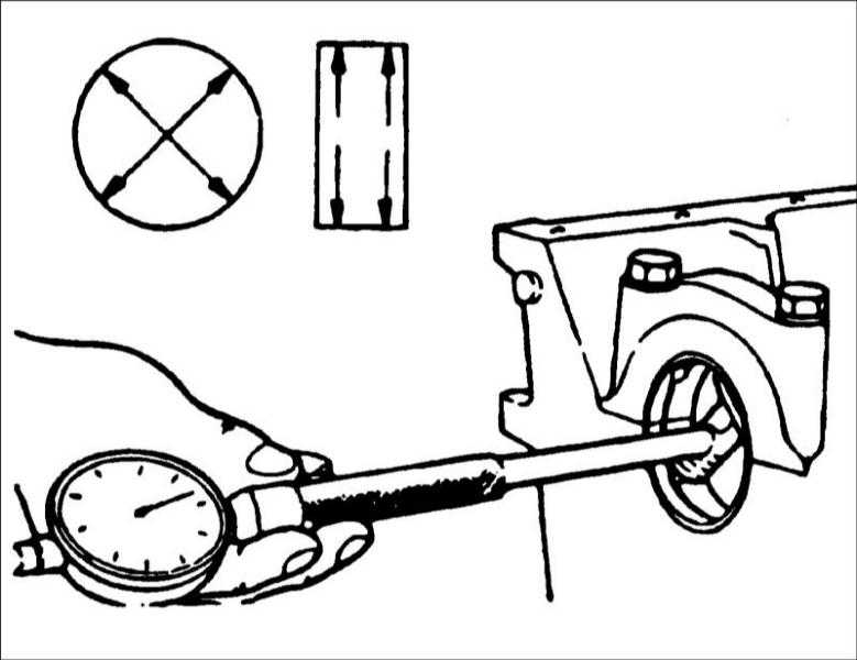 2. Микрометром измерьте диаметры шеек коленчатого вала в двух диаметрально противоположных направлениях. При наличии конусности или овальности перешлифуйте коленчатый вал.